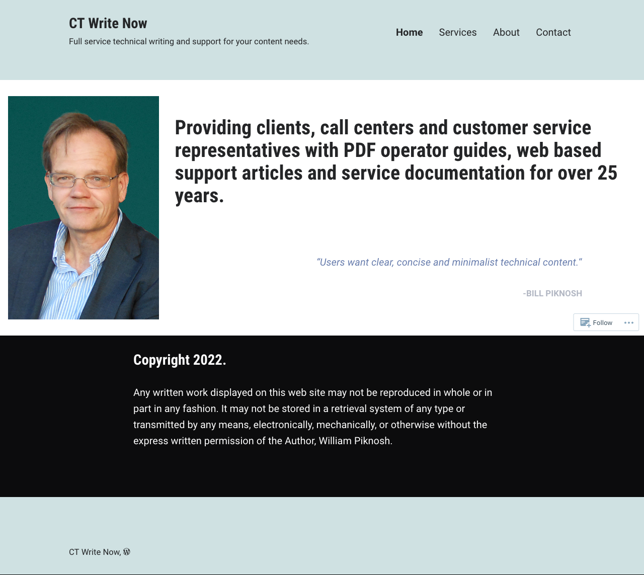 Bill is a friend I made in Connecticut. He is a technical writer, and came to me for assistance getting online for contract work.